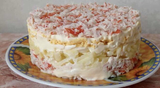 Maigi un gaisīgi svētku salāti “Sniega krabis”: tikai 4 sastāvdaļas un 15 minūtes brīva laika, bet tie vienmēr tiek apēsti pirmie
