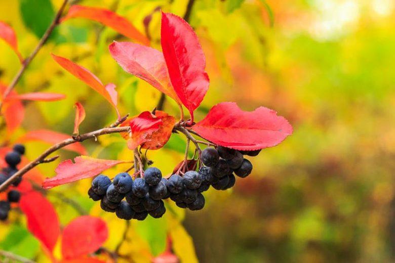 Kalnu aronija (Aronia melanocarpa) – lapas spilgti sarkanas, ogas melnas un spīdīgas – izskatās kontrastaini.
