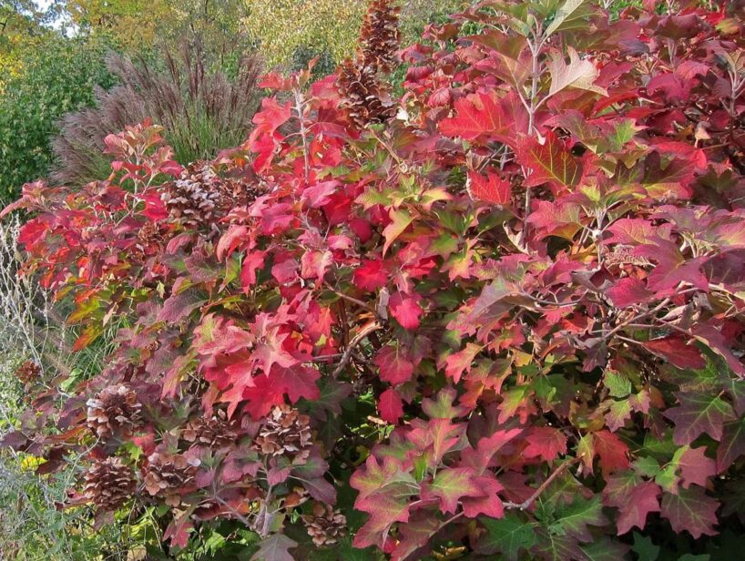 Kļavlapu hortenzija (Hydrangea quercifolia) – lapas kļūst sarkanbrūnas, bet ziedu skaras saglabājas dekoratīvas līdz pat pirmajam sniegam.