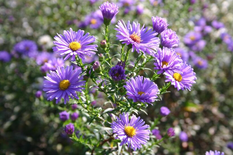 Asteres (Aster novi-belgii, Aster novae-angliae) – bagātīgi zied septembrī–oktobrī; tās pieejamas zilā, rozā, violetā krāsā.
