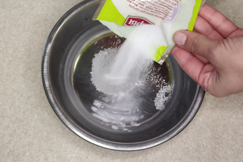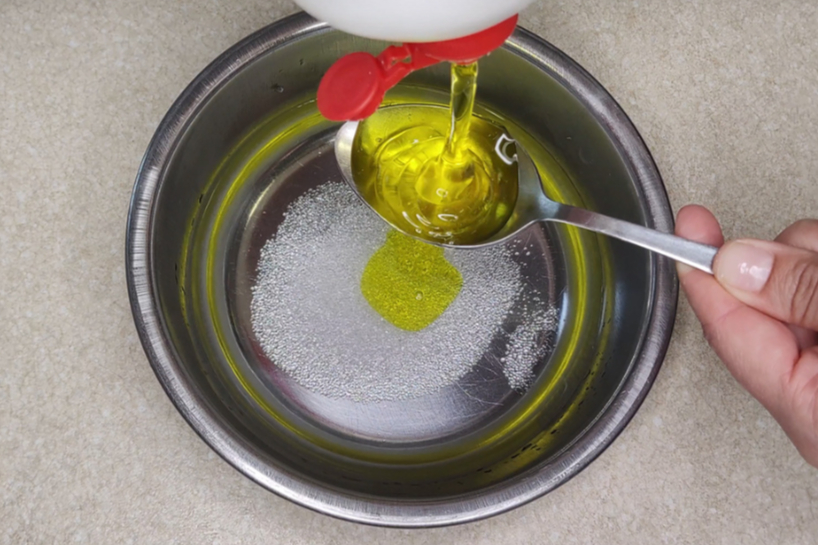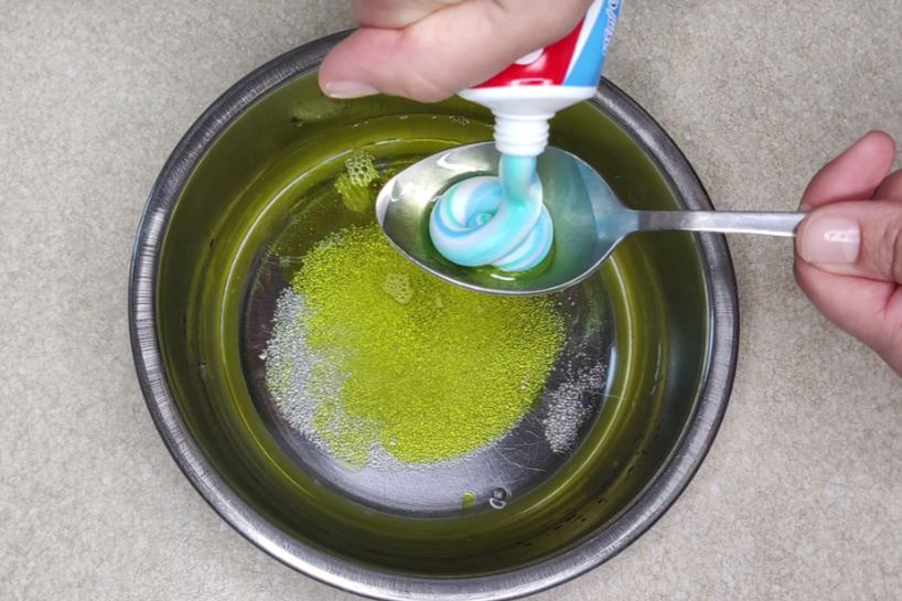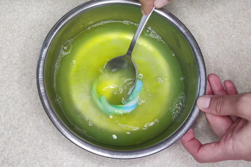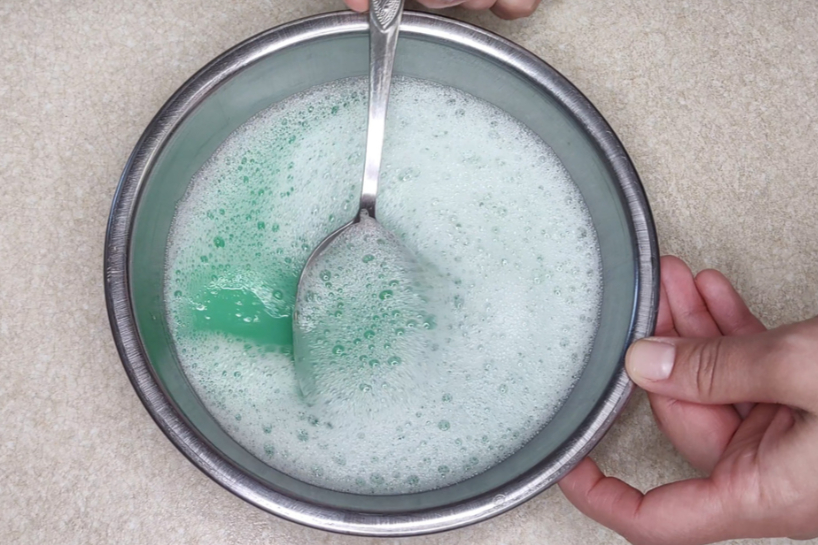 Kad visas sastāvdaļas ir traukā, rūpīgi tās samaisiet. Maisīšanas laikā veidosies daudz putu — tas ir normāli, jo trauku mazgāšanas līdzeklis reaģē ar citronskābi.