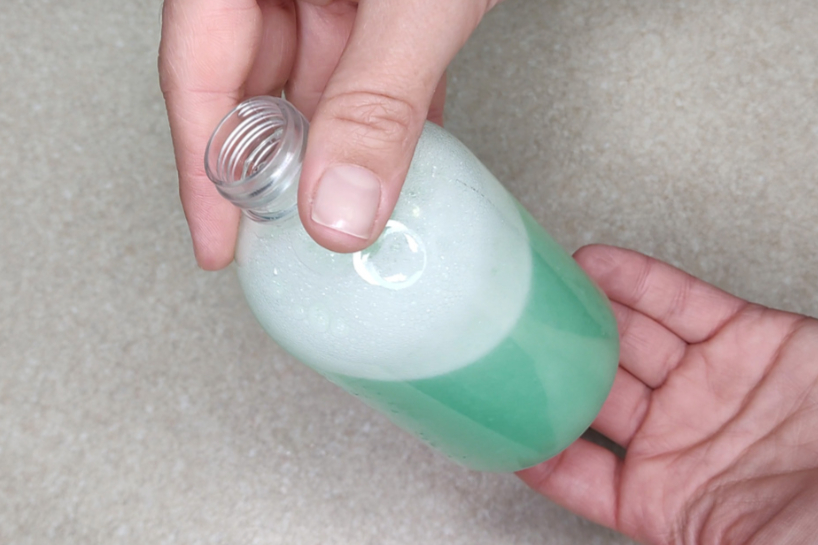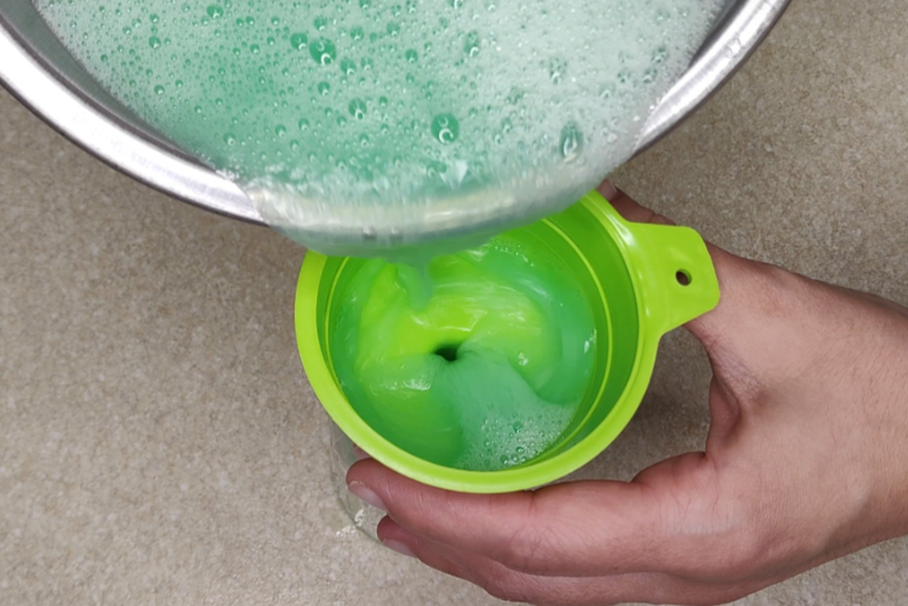 Pagaidiet pāris minūtes, līdz putas nosēžas, lai maisījums būtu viendabīgs un to varētu vieglāk pārliet pudelē.