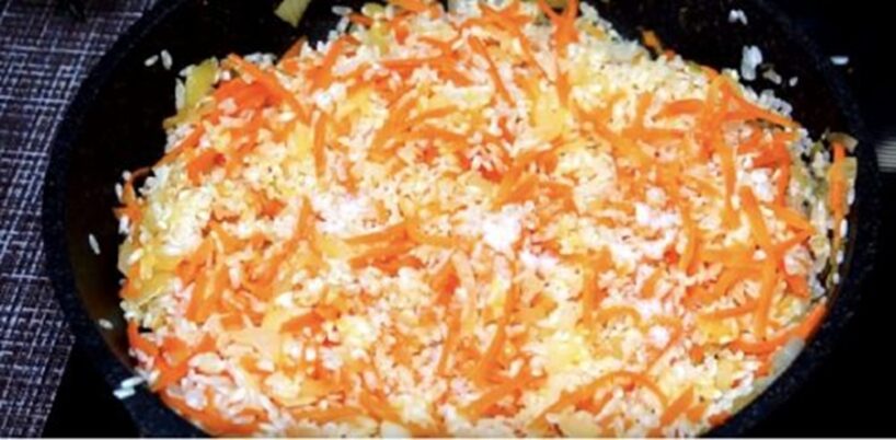 Pēc tam pievienojam burkānus, apcepam apmēram minūti, tad pievienojam noskalotus rīsus (350 g), samaisām, pievienojam ½ tējkarotes sāls un melnos piparus pēc garšas. Pēc samaisīšanas noņemam no uguns.