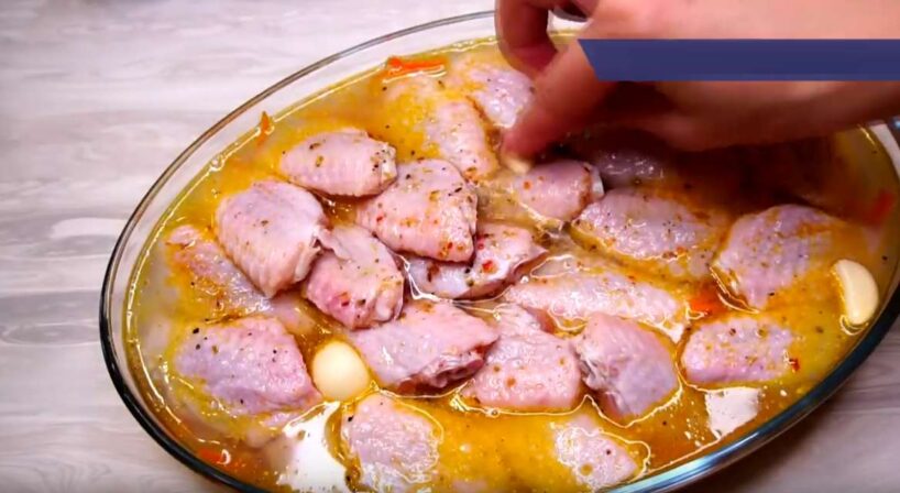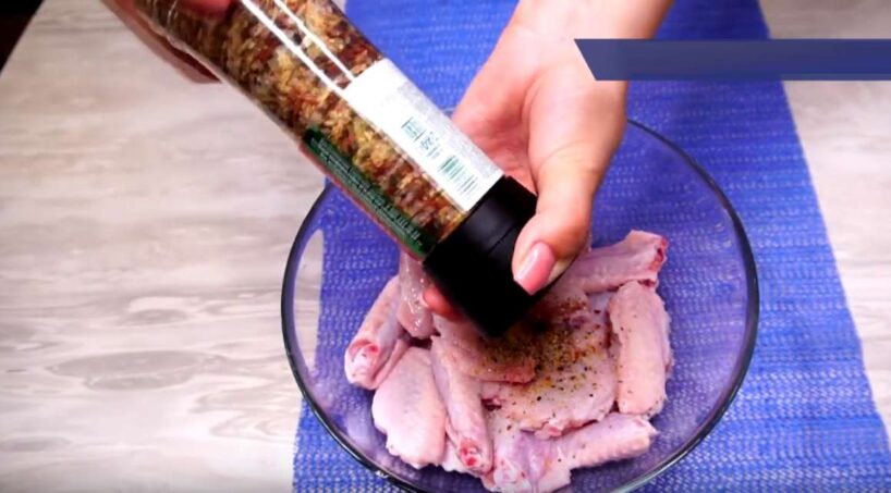 Vispirms padarbosimies pie spārniņiem. Es tos pārgriežu uz pusēm. Manā gadījumā tie sver tieši 700 g. Pievienoju gandrīz pilnu tējkaroti sāls, pieleju 2–3 ēdamkarotes eļļas un pievienoju aptuveni tējkaroti gaļas garšvielu, bet var pievienot arī pēc garšas.
