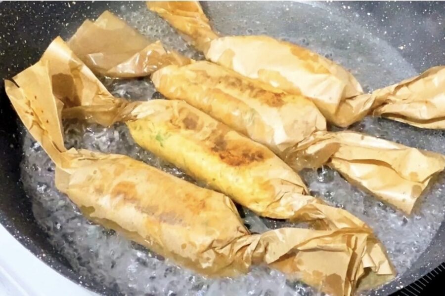 Šādu paciņu lieku uz pilnīgi sausas un jau labi uzkarsētas pannas. Nevienu pilienu eļļas nevajag. Vidēji uz katru pusi pietiek ar 2–3 minūtēm uz vidējas uguns. Papīrs sākumā var nedaudz palikt brūngans, bet par to nav jāuztraucas.