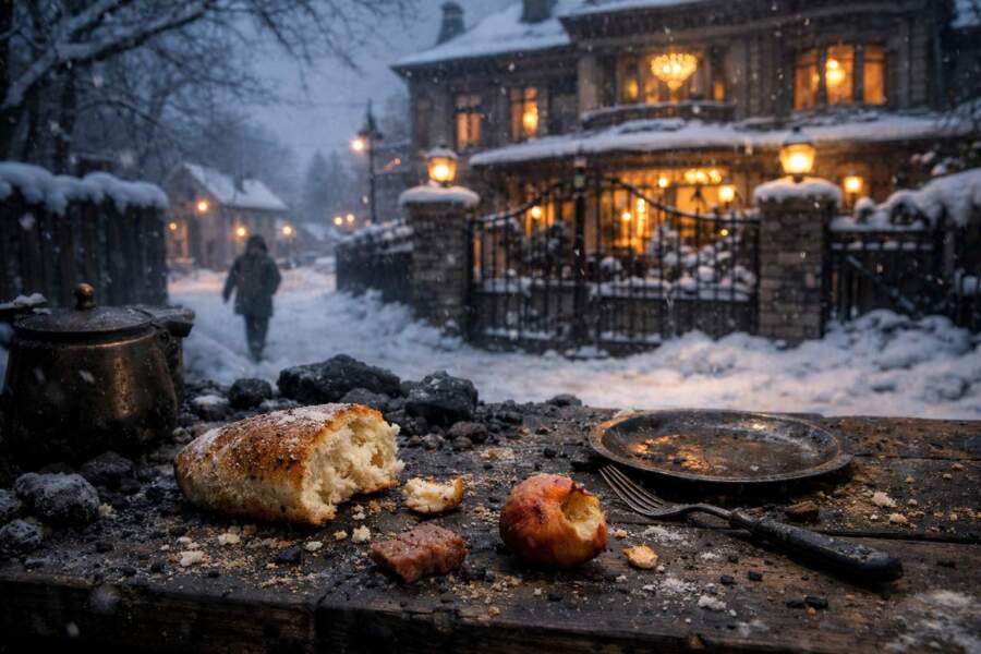 Maize no sveša galda. Ogļu putekļi un drupačas. Ziema šogad atnāca agri — jau novembra vidū sniegs klāja mazpilsētas ielas biezā kārtā, pārvēršot pelēko ikdienu baltā klusumā