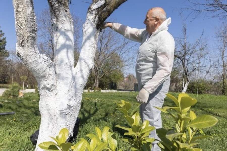 Balta krāsa uz koku stumbriem martā palīdz pasargāt mizu no plaisāšanas krasu temperatūras svārstību dēļ un ierobežo kaitēkļu izplatību dārzā.