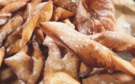 Izrullējiet mīklu plānā, caurspīdīgā kārtā, apmēram 2-3 mm biezumā. Sagrieziet izrullēto mīklu apmēram 3-4 cm platās strēmelēs. Katras strēmelītes centrā izveidojiet garenisku iegriezumu. Izveriet vienu strēmelītes galu caur iegriezumu, izveidojot dekoratīvu pīrāgu.
