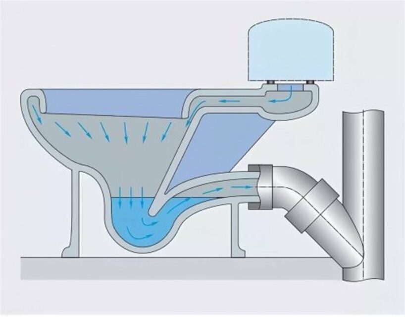Kāpēc tad tāds liels ūdens tilpums? Lai saprastu loģiku, jāaplūko amerikāņu tualetes darbības princips:
