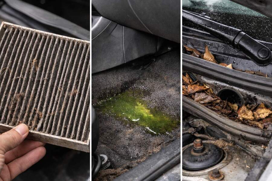 Paskatieties zem paklājiņiem, vai tur nav peļķu. Ja tur ir slapjš, meklējiet avotu: varbūt aizsērējusi kondicioniera drenāža, varbūt savu laiku nokalpojušas blīvgumijas, bet varbūt tek antifrīzs no sildītāja.