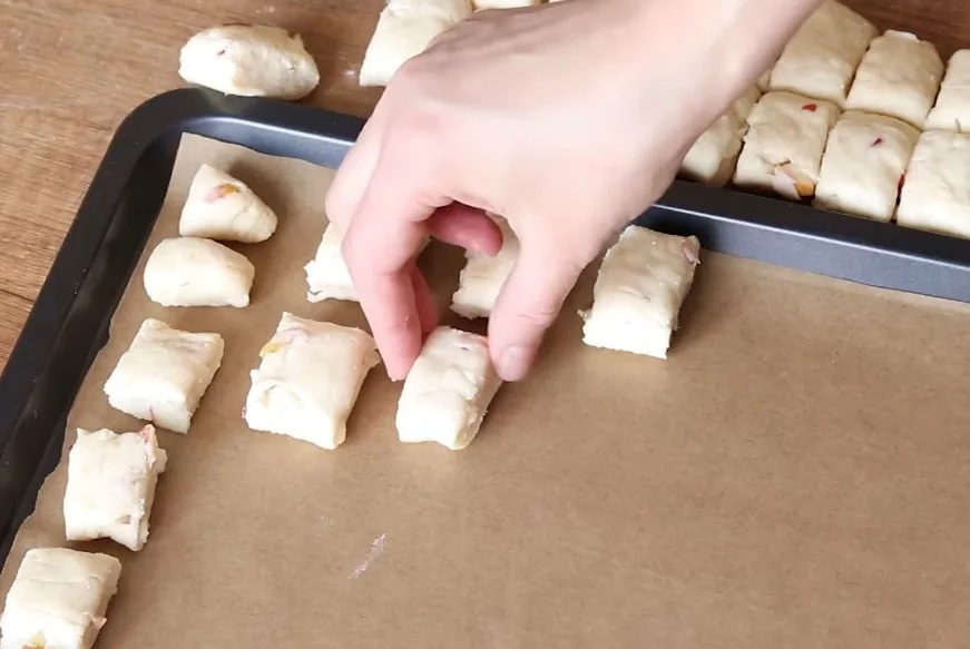 Pati svarīgākā nianse ir ābolu pievienošana. Smalki sagriezti ābolu kubiņi tiek iemaisīti tieši mīklā, pēc tam no tās izveido nelielu “desiņu”. To sagriež vienādos gabaliņos un kārto uz pannas, kas izklāta ar cepamo papīru.