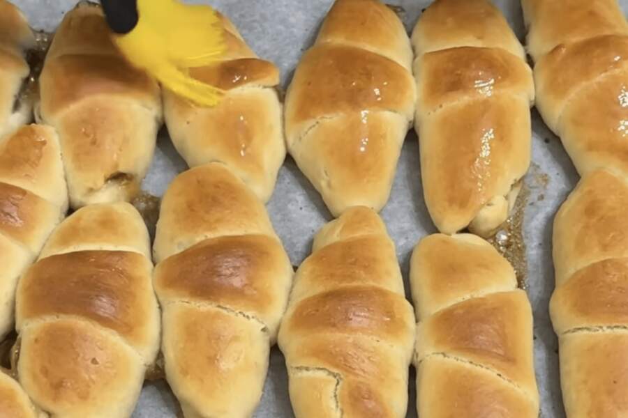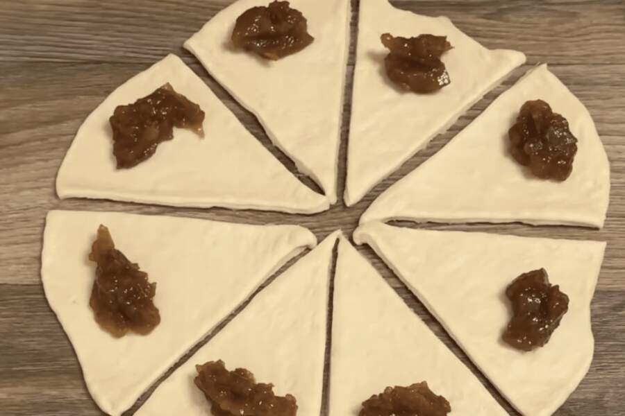 Pildījuma ielikšana. Uz katra trijstūra platākās malas uzliek izvēlēto pildījumu. Tad mīklu sarullē virzienā uz šauro galu, izveidojot glītu radziņu.
