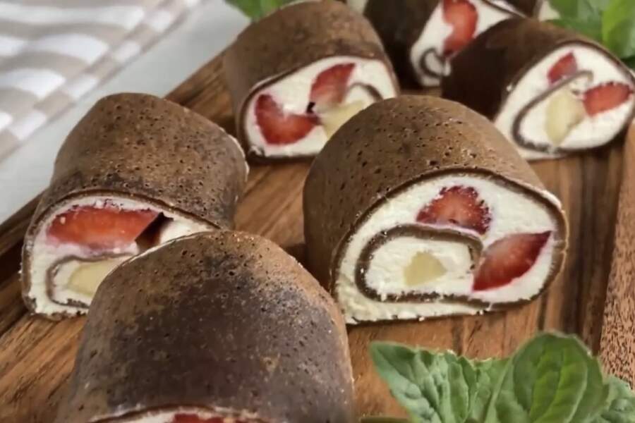 Brīvdienu rītos, kad mājās visi jau ir pamodušies, reizēm gribas pagatavot ko nedaudz neierastāku par parastām pankūkām. Nesen pamēģināju desertu, kurā klasiskas šokolādes pankūkas tiek pildītas ar krēmīgu biezpienu un svaigiem augļiem. Tas izskatās pēc smalkas kūkas, bet darba pie plīts ir pavisam maz.