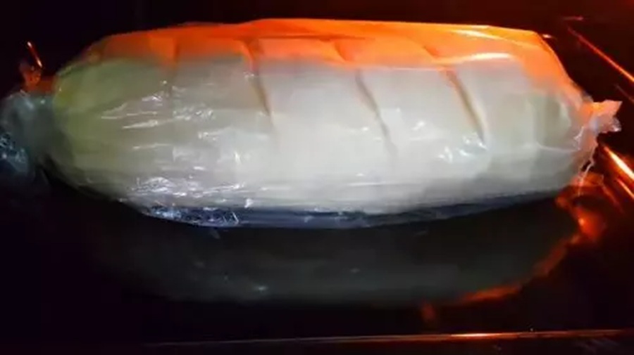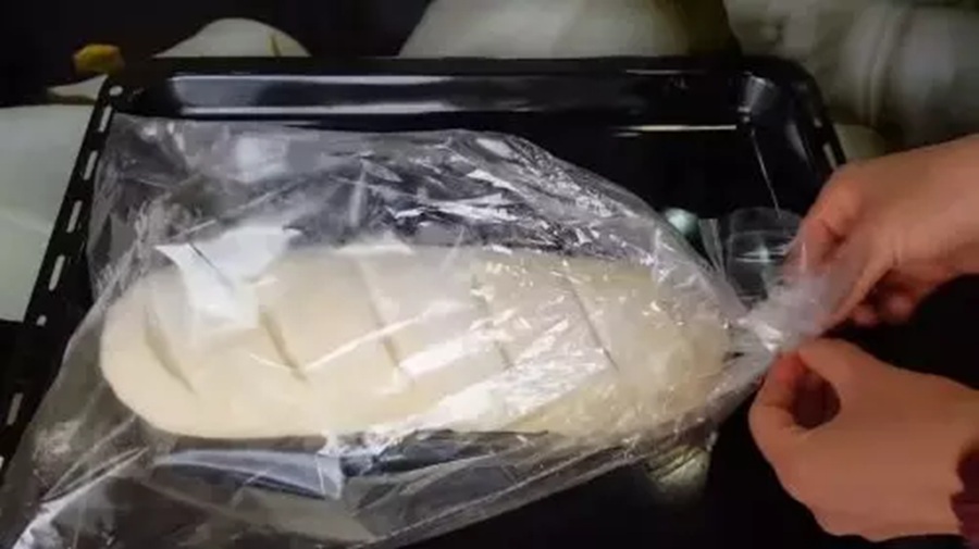 Sagatavošana cepšanai: Pārlieciet sagatavi cepšanas maisā (rokavā) un cieši aizsieniet abus galus. Novietojiet to uz cepešpannas. Atstājiet siltā vietā vēl uz 20 minūtēm, lai maize vēlreiz paceltos.