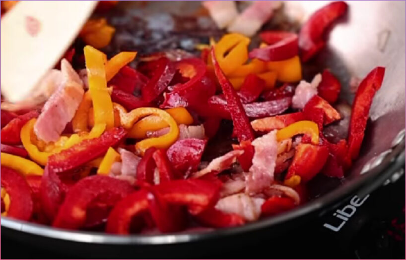 Sagrieziet bekonu gabaliņos un apcepiet pannā. Sagrieziet papriku strēmelītēs, lieciet pannā un cepiet vismaz piecas minūtes uz mērenas uguns.