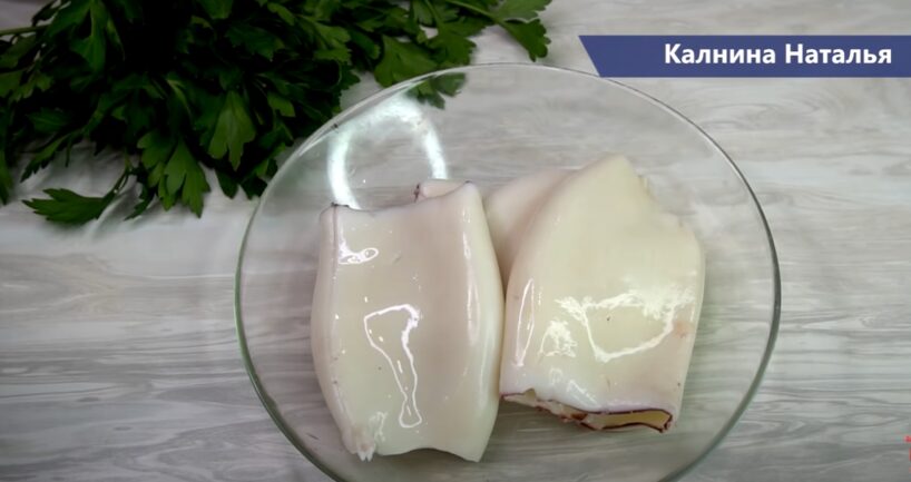 Novāriet kalmārus. Es tos vāru šādi: uzvāru ūdeni, pēc tam ievietoju tajā nomazgātos kalmārus, iepriekš izņemot to iekšas. Es kalmārus vāru 1 minūti no brīža, kad tos ielieku verdošajā ūdenī un izņemu no ūdens. Es tos nekavējoties ievietoju aukstā ūdenī, lai apturētu vārīšanos, vēlreiz nomazgāju, noņemu membrānu un sagriežu strēmelītēs.