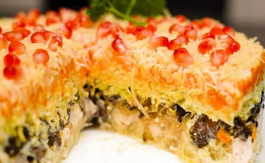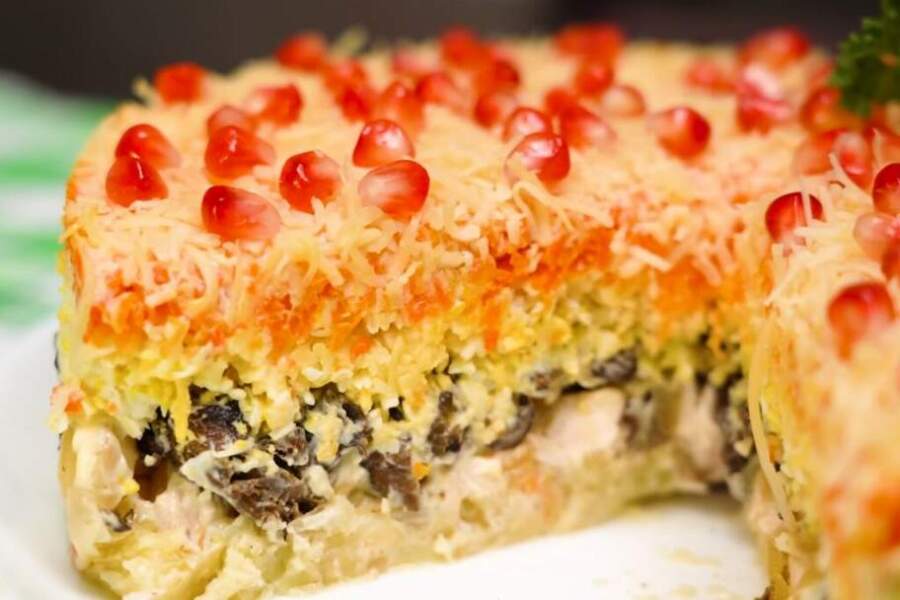 Kad sēnes ir gatavas, tām obligāti jāļauj pilnībā atdzist pirms pievienošanas salātiem, lai siltums nesabojātu majonēzes struktūru. Šo slāni liek tieši virs vistas un atkal viegli pārziež.