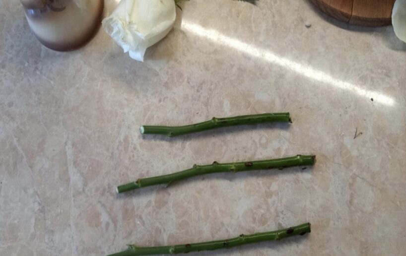 Griežu spraudeņus 12–15 cm garumā ar trim pumpuriem. Apakšējo griezumu veicu slīpi, 45° leņķī, apmēram 5 mm zem pumpura. Augšējo — taisni, aptuveni centimetru virs augšējā pumpura.