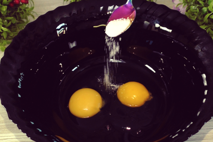 Bļodā ielieku 2 olas. Norādītais sastāvdaļu daudzums ir paredzēts pannai ar 28 cm diametru. Pievienoju sāli un samaisu.