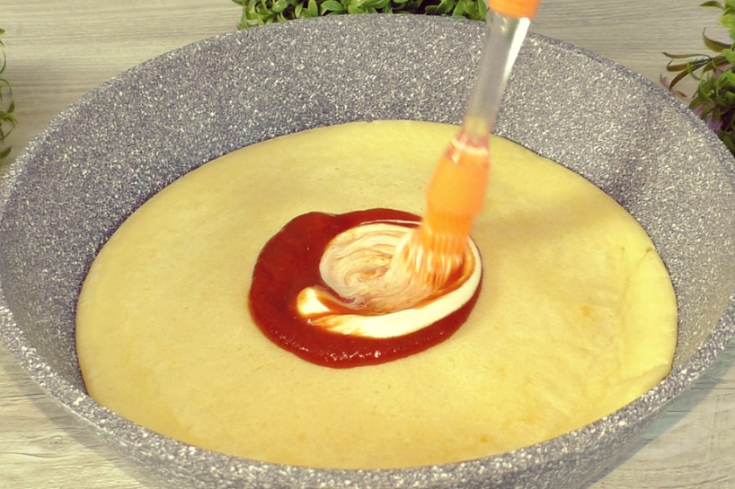 To var izdarīt ar lāpstiņu — sagatave apgriežas viegli. Apziežu pamatni ar tomātu pastu, kečupu, mērci un majonēzi.