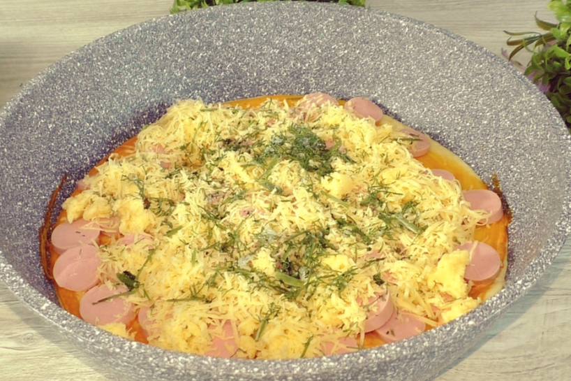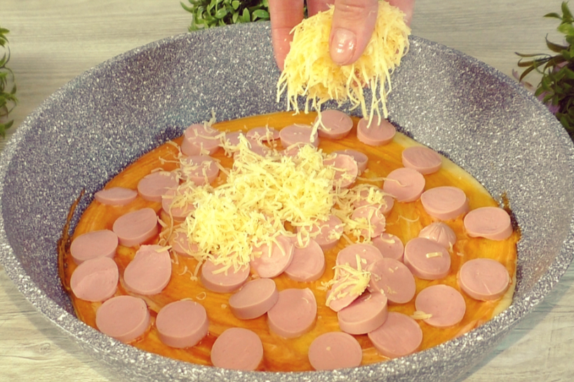 Pa virsu lieku jebkādu pildījumu. Man ir pats vienkāršākais variants — cīsiņi. Ja ir tomāti vai bulgāru pipari, tos arī var pievienot.