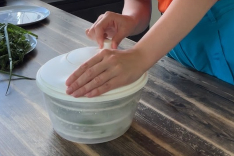 Es savu pirku pirms daudziem, daudziem gadiem “Ikea”, bet līdzīgus var atrast arī interneta veikalos. Ja tāda “mašīna” jums nav, var vienkārši rūpīgi nosusināt zaļumus ar papīra dvieļiem.