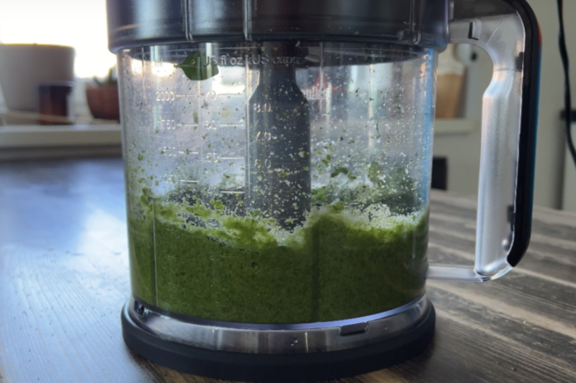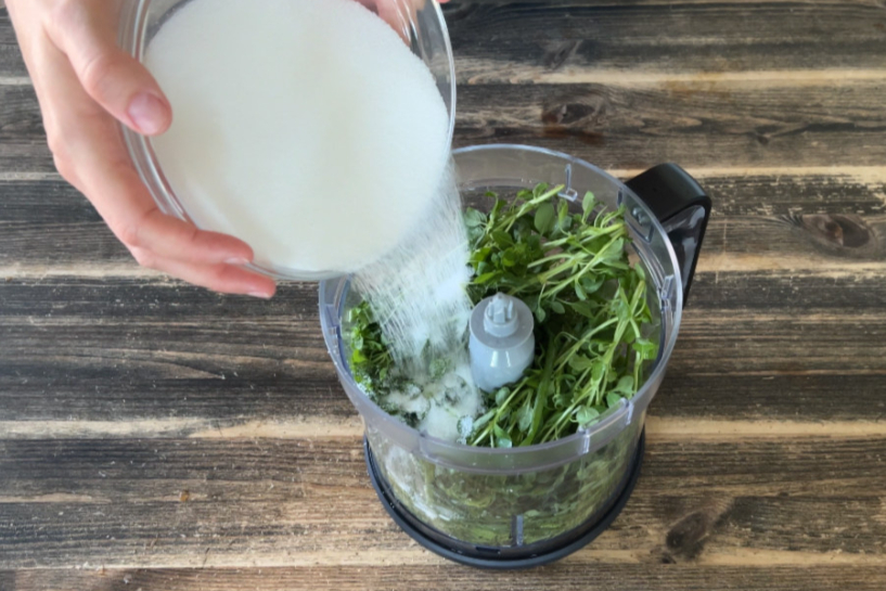 Tālāk mums būs vajadzīgs blenderis. Man bija liela virtuves kombaina bļoda, bet jūs varat izmantot arī parasto rokas blendera uzgali un dziļu bļodu. Ieliekam zaļumus blenderī un pieberam sāli.