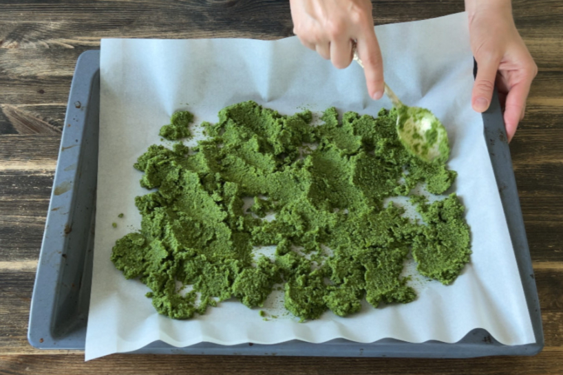 Liekam 50 °C temperatūrā uz konvekcijas režīma un žāvējam apmēram 2–4 stundas. Precīzs laiks atkarīgs no zaļumu daudzuma — jāžāvē līdz pilnīgai gatavībai. Ja sāls paliks mitra, tā vienkārši sabojāsies.