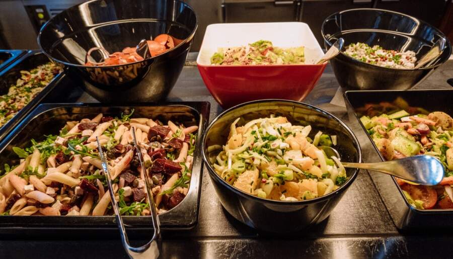 Šeit redzami kruasānu kalni, salāti visās varavīksnes krāsās un desertu lete ar kūciņām, ko rotā gaisīgas krēma rozītes. Acis burtiski skrien uz visām pusēm, un šķiet, ka esi nokļuvis ēdiena paradīzē.