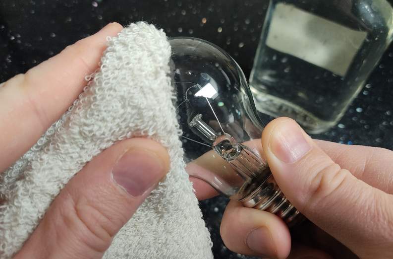 2.Līdzekļa izvēle: Samitriniet drānu parastā spirtā. Protams, var izmantot arī ierasto, ko var nopirkt veikalā, taču mēdz teikt, ka tērēt labu mantu spuldzēm ir grēks, tāpēc spirts būs tieši laikā.