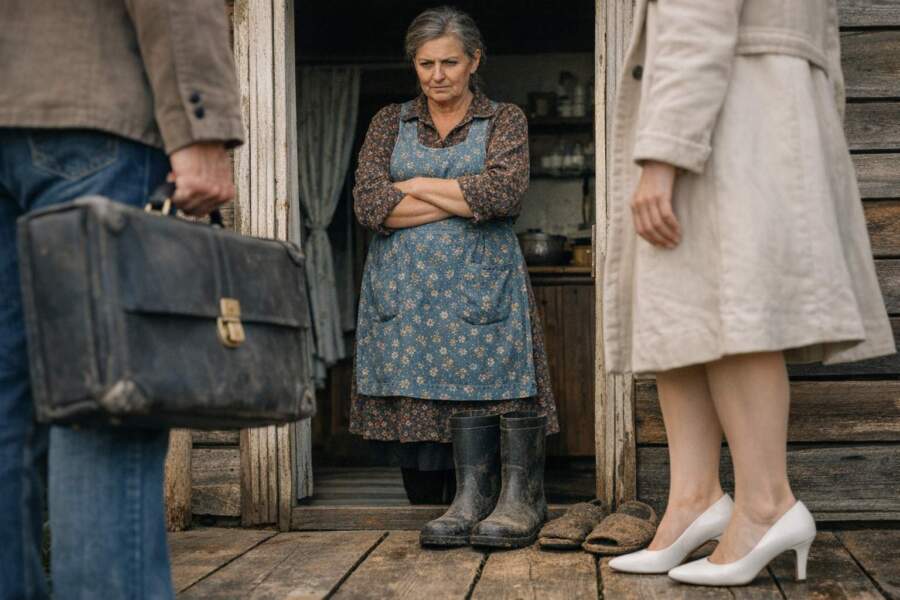 Vīramāte mūs sagaidīja uz sliekšņa, rokas zem priekšauta salikusi, it kā slēptu tās no rokas spiediena. Viņas pelēko acu skatiens, ciešs un auksts, pārslīdēja manai sejai, vieglajam ceļa mētelim, vīra rokā esošajam koferim un apstājās pie manām kurpēm