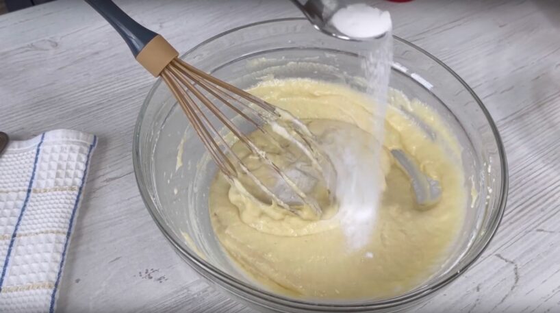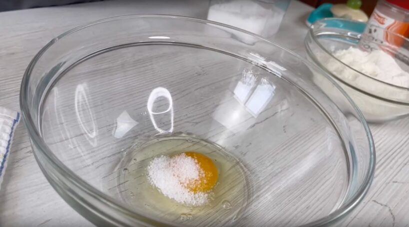 Bļodā sakuļ olu ar cukuru un sāli līdz viendabīgai masai. Pievieno kefīru istabas temperatūrā un labi samaisa.