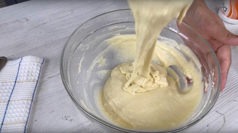 Milti jāpiesijā – tā mīkla būs gaisīgāka un bez kunkuļiem. Maisi, līdz iegūsti biezu, bet vijīgu konsistenci.