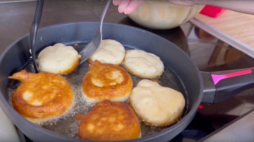 Uzkarsē pannu ar nelielu daudzumu eļļas. Ar karoti liec mīklu pannā un cep uz vidējas uguns no abām pusēm, līdz tā kļūst zeltaina.