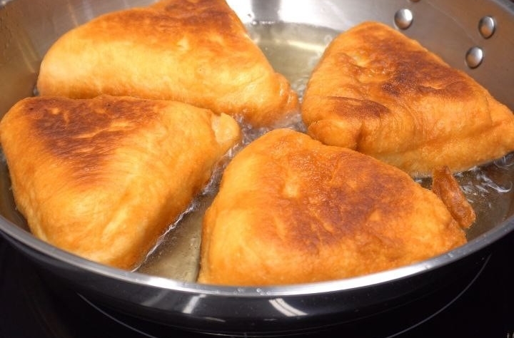 Sadala mīklu 60 g gabaliņos un izrullē tos apļos. Centrā ieliek karoti pildījuma un saspied malas, lai izveidotu trīsstūri. Padoms: Ja malas saspiedīsi ar mitriem pirkstiem, pīrādziņi cepšanas laikā neatvērsies. Cep uz vidējas uguns augu eļļā, līdz tie ir zeltaini brūni no abām pusēm. Gatavos pīrādziņus novieto uz papīra dvieļa, lai noņemtu lieko eļļu.