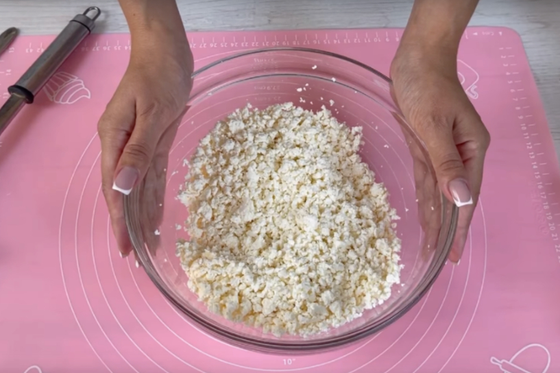 1. Biezpiena sagatavošana: Izvēlieties biezpienu ar tauku saturu 5–9%. Ja biezpiens ir mitrs, labāk to iepriekš nolikt sietā vai marlē un viegli nospiest, lai notek liekā sūkalas.