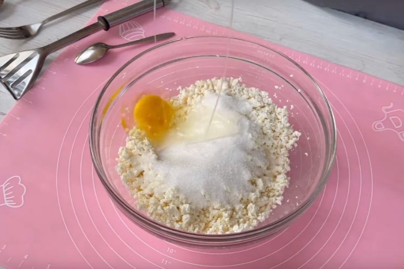 2. Sastāvdaļu sajaukšana: Bļodā sajauciet biezpienu, cukuru un sāli. Pievienojiet olu un rūpīgi samaisiet. Ja biezpiens ir graudains, to var izberzt caur sietu vai sablendēt ar rokas blenderi, vai arī, kā es daru, saspaidīt ar kartupeļu stampu.
