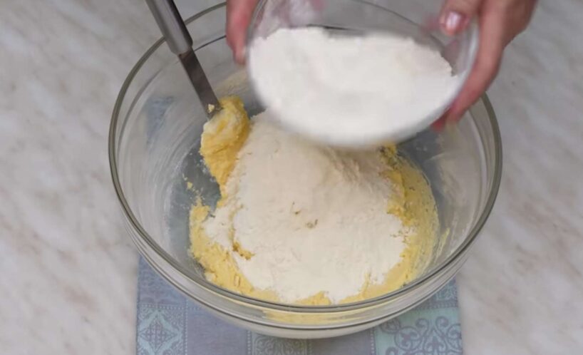 2. Tad mīklai pievienojam vienu olu un kanēli – atkal visu kārtīgi samaisām. Pēc tam caur sietiņu iesijājam šajā masā miltus, pievienojam cepamo pulveri un kārtīgi visu maisa un mīca. Beigu beigās, mīklai jābūt kā vieglai, mazliet ķepīgai, bet viendabīgai masai.