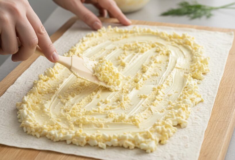 Uz izklāta lavaša vienmērīgi uzklāj sajaukto siera, olu, ķiploka un zaļumu masu, cieši satin ruletē un liek ledusskapī, lai tā kļūtu stingra un viegli griežama.