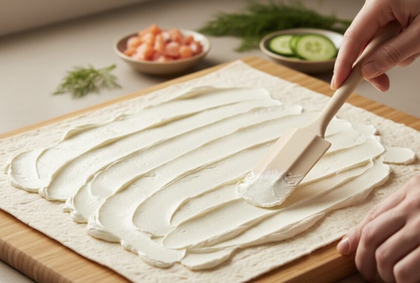 Lavašu vienmērīgi pārsmērē ar mīkstu krēmsieru, virsū kārto lasi, gurķi un salātlapas, ruleti cieši satin un liek ledusskapī, lai garšas savelkas un griezums izskatās tīrs un kārtains.
