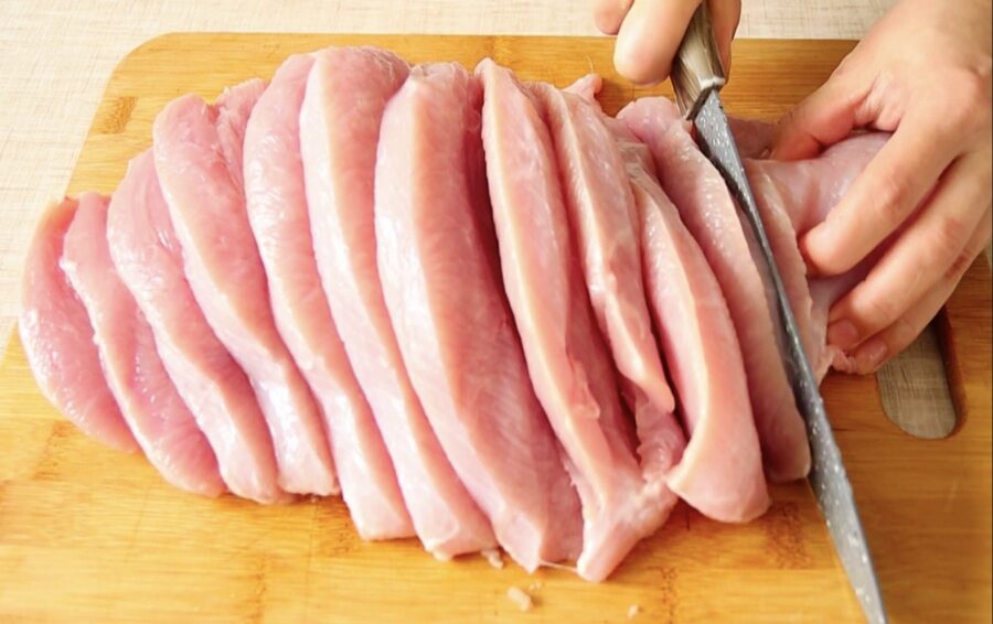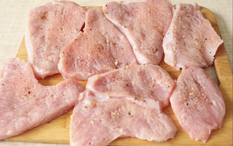 Es parasti izmantoju vistas vai tītara fileju. Sagriežu to glītos, platos gabalos. Šeit ir pirmais svarīgais mirklis: gaļa ir kārtīgi jāizklapē.