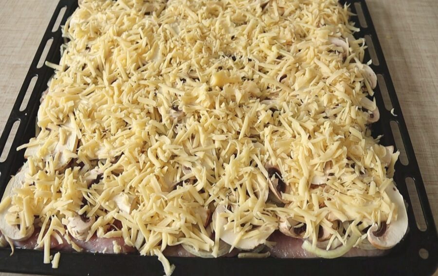 Nākamais solis ir šampinjoni. Tos griežu plānās šķēlītēs. Sēnes kopā ar sīpoliem veido tādu kā dabisku “segu” gaļai. Visam pa virsu nāk rīvēts siers un plāna majonēzes kārtiņa.