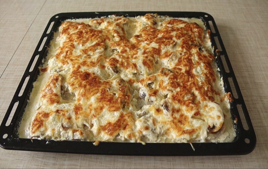 Galvenais ir tas, ka gaļa burtiski peldas dārzeņu un sēņu sulā. Kamēr siers augšpusē lēnām kūst un veido garoziņu, fileja apakšā paliek mīksta un sulīga. Nekādas cepšanas pannā, nekādu eļļas dūmu – tikai saliec visu veidnē un gaidi rezultātu.