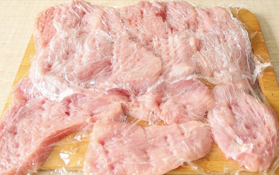 Es to daru caur pārtikas plēvi, lai virtuve paliktu tīra. Ja gabaliņus izklapē no abām pusēm, tie kļūst plānāki, mīkstāki un daudz labāk uzsūc garšvielas.