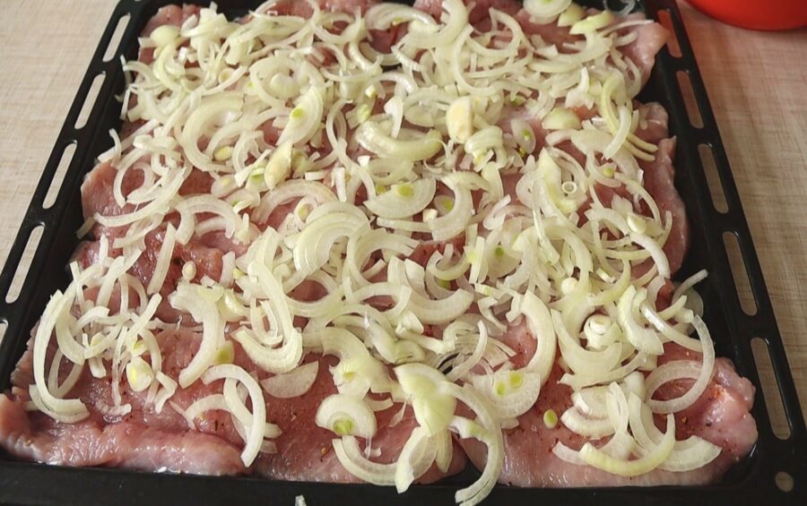 Tālāk seko sīpoli. Esmu pamanījis, ka šeit strādā likums – jo vairāk sīpolu, jo labāk. Tieši sīpols ir tas, kurš cepoties atdod gaļai visu savu saldumu un neļauj tai kļūt sausai. Sagriežu tos pusgredzenos un dāsni pārberu pāri filejai.