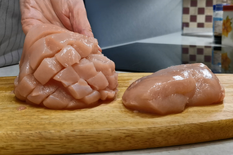 Tātad, sāksim gatavot. Ņemam vistas fileju un veicam krustveida iegriezumus no abām pusēm. Iegriežam diezgan dziļi. Fileja sanāk kā kubiks. Ieliekam to bļodā.