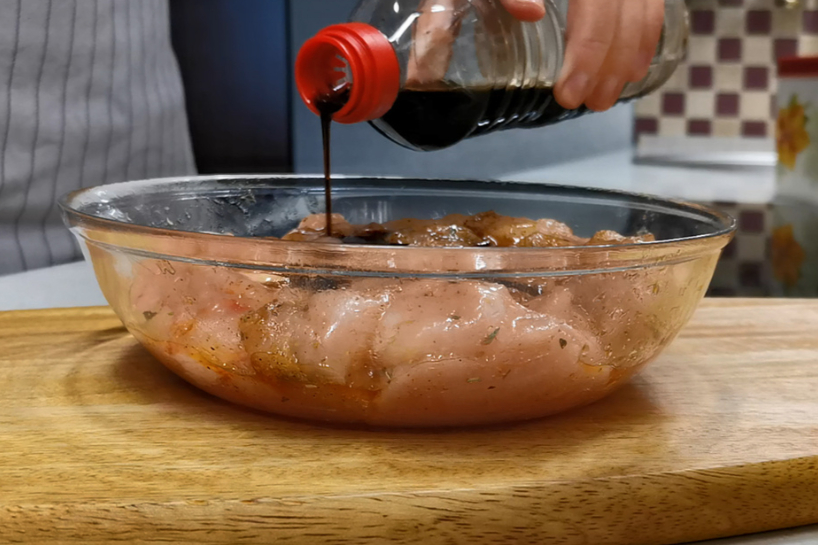 Aizklājam bļodu ar pārtikas plēvi un atstājam uz 15 minūtēm. Pēc tam bļodā ielejam sojas mērci un jebkuru medu. Arī par medu īpaši neuztraucieties. Zinu, ka daži nevēlas un nemīl to izmantot.