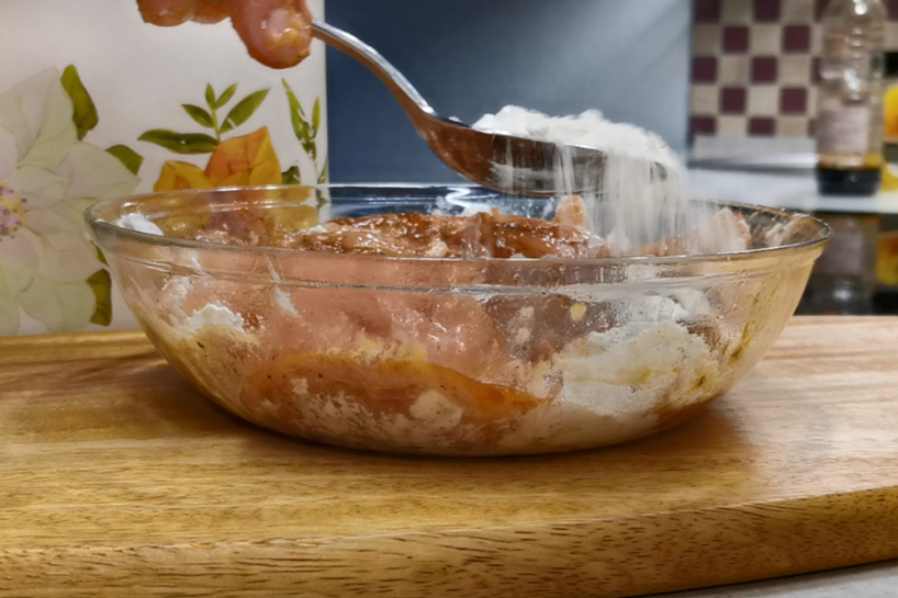 Un tad uzreiz pārkaisām fileju no abām pusēm ar miltiem.
