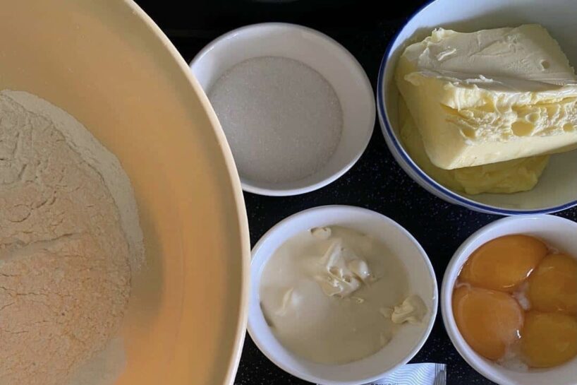 Vispirms sagatavo rauga mīklu. Svaigos raugu saberž ar cukuru, līdz tas pilnībā izšķīst un kļūst šķidrs. Mīkstu sviestu ieberž ar miltiem, līdz veidojas drupena masa. Pievieno skābo krējumu, olu dzeltenumus un sagatavoto rauga maisījumu.