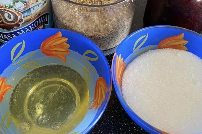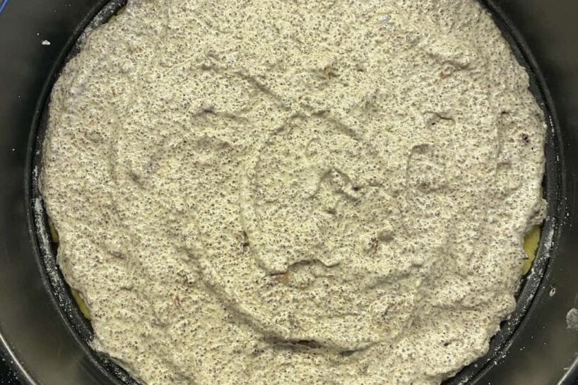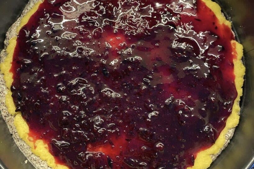 Pirmo daļu izrullē, ieklāj formā un pārklāj ar magoņu pildījumu.